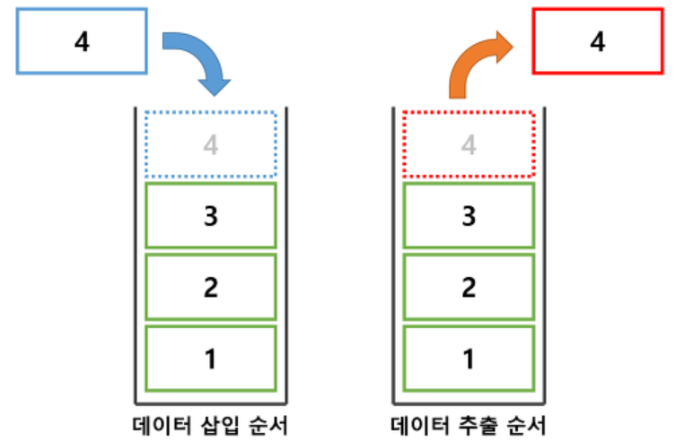 위 그림은 stack을 표현한 것으로 왼쪽은 PUSH(삽입)를 의미하고 오른쪽은 POP(추출)을 의미한다.