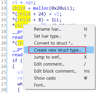 2. malloc의 반환값을 우클릭하고 Create new struct type ...을 선택한다.